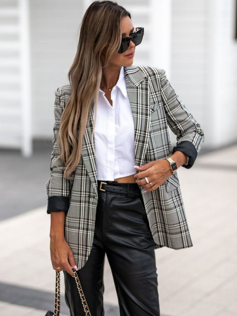 Blazer Feminino Moderno Com Gola Aberta E Bolsos Manga Comprida Roupa Xadrez