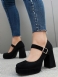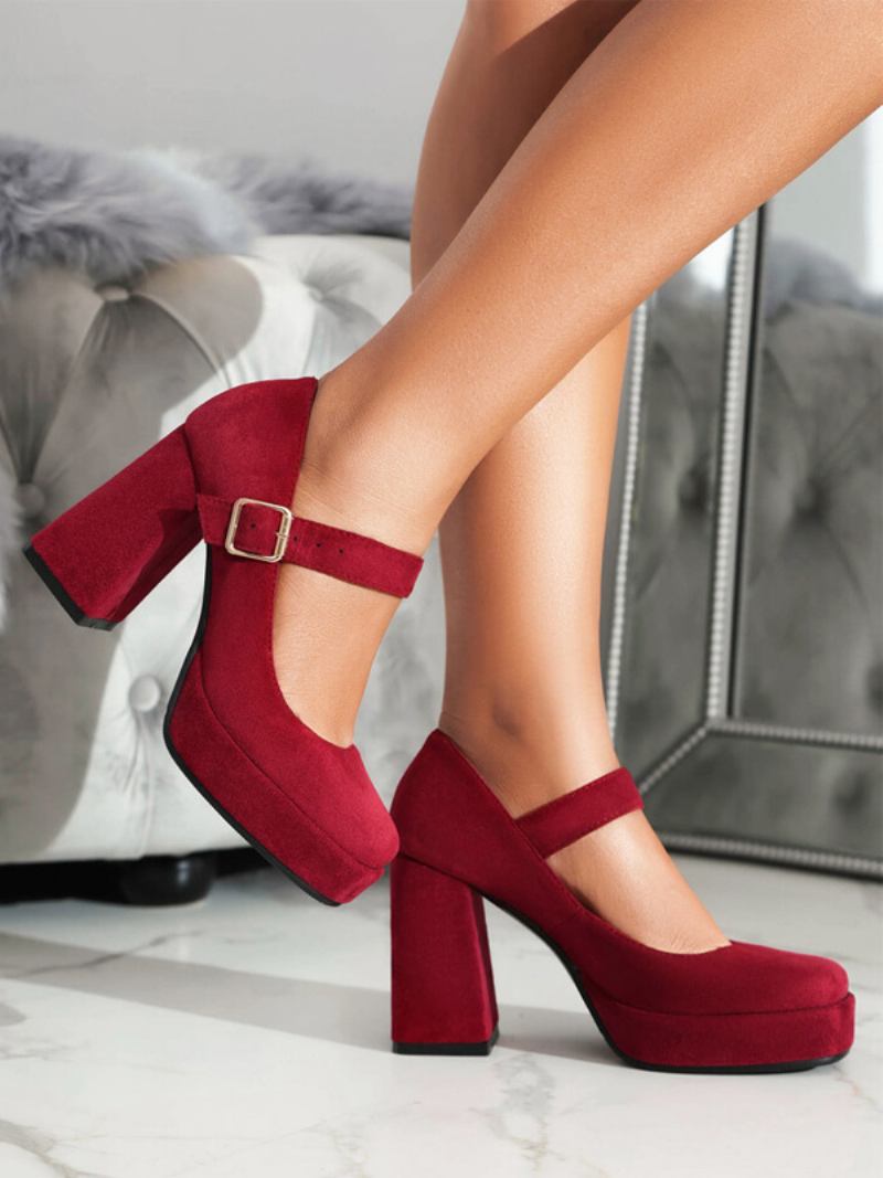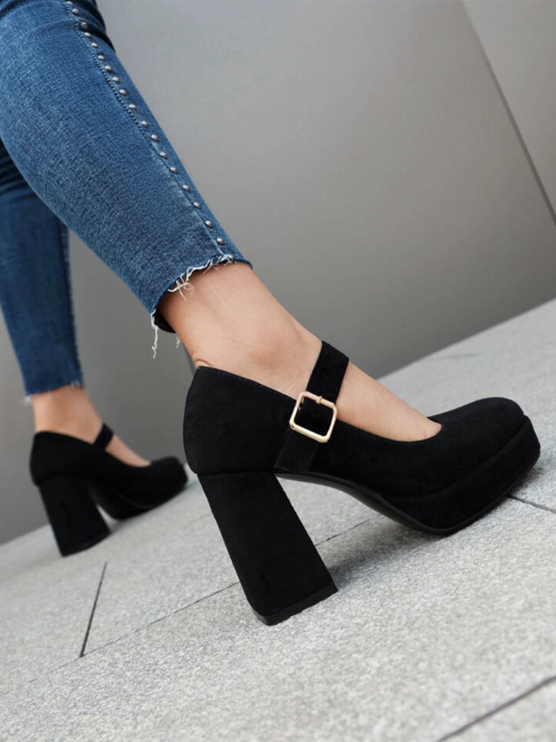 Bombas Plataforma Feminina Dedo Do Pé Quadrado Salto Grosso Fivela Tiras Mary Jane