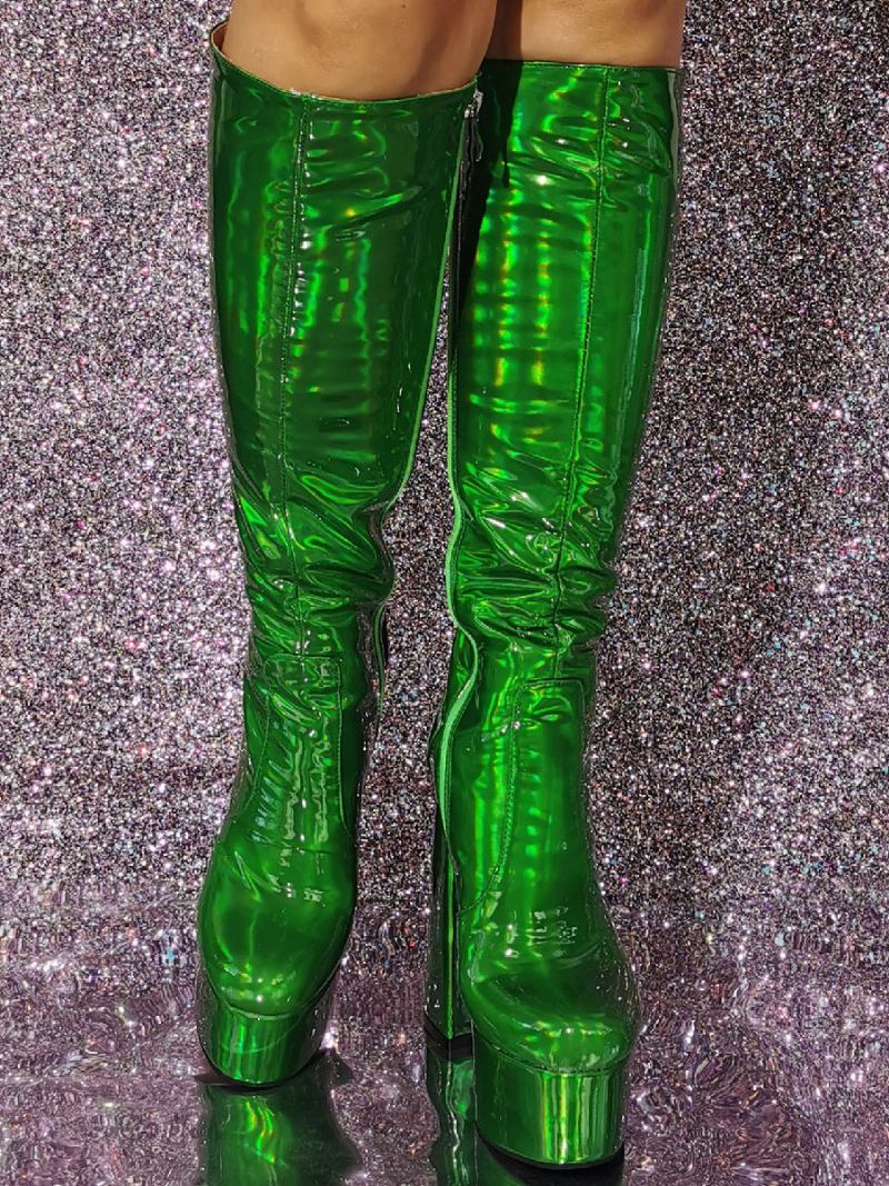 Botas Altas Joelho Metálicas Femininas Patente Pu Plataforma Salto Robusto Sexy