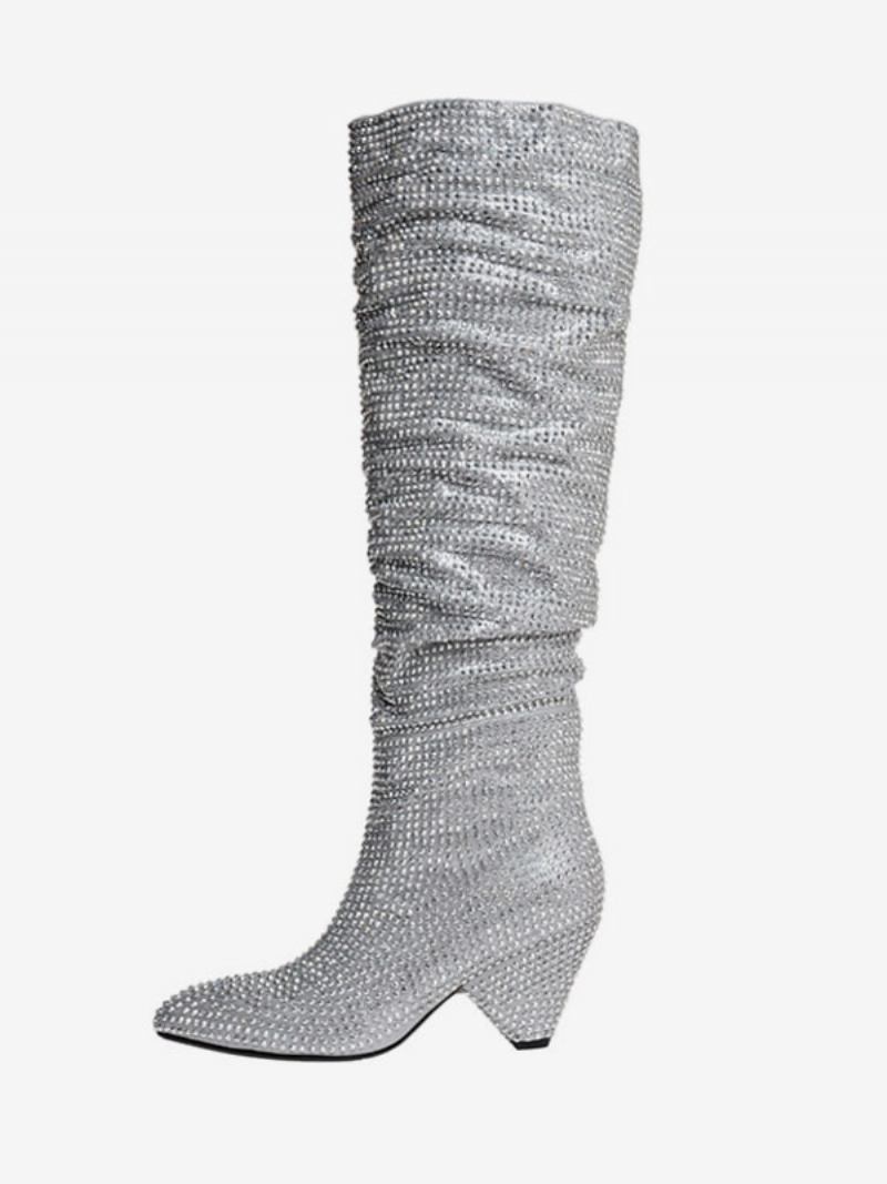 Botas Altas Joelho Pretas Femininas Com Strass Couro Pu Salto Cônico Na Altura Do