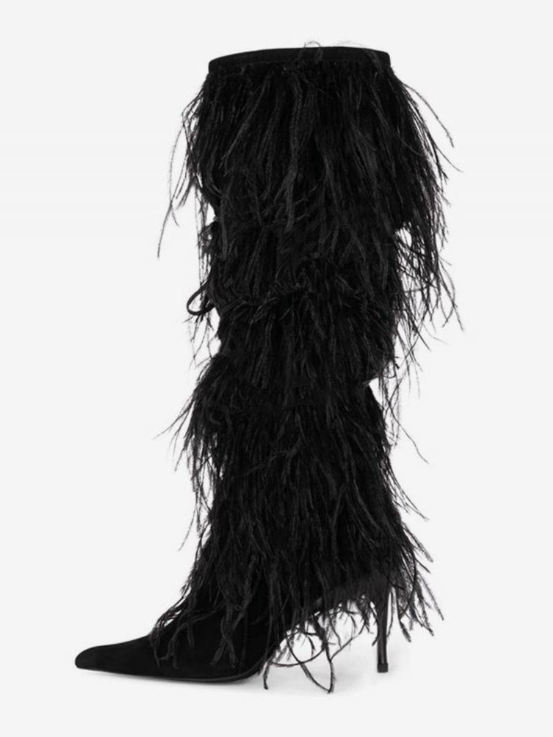 Botas Azuis Até O Joelho Femininas Com Detalhes Penas E Salto Agulha Na Altura Do