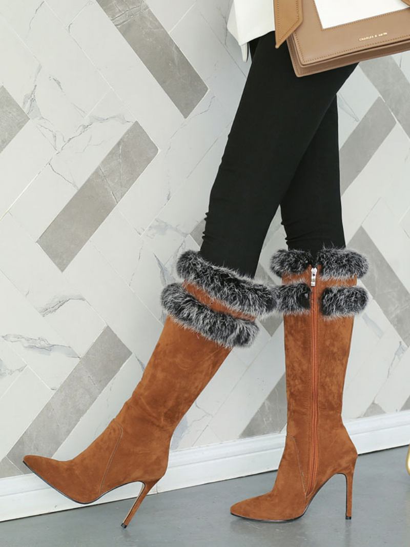 Botas Cano Alto Femininas Micro Camurça Pele Sintética Bico Fino Salto Agulha Inverno