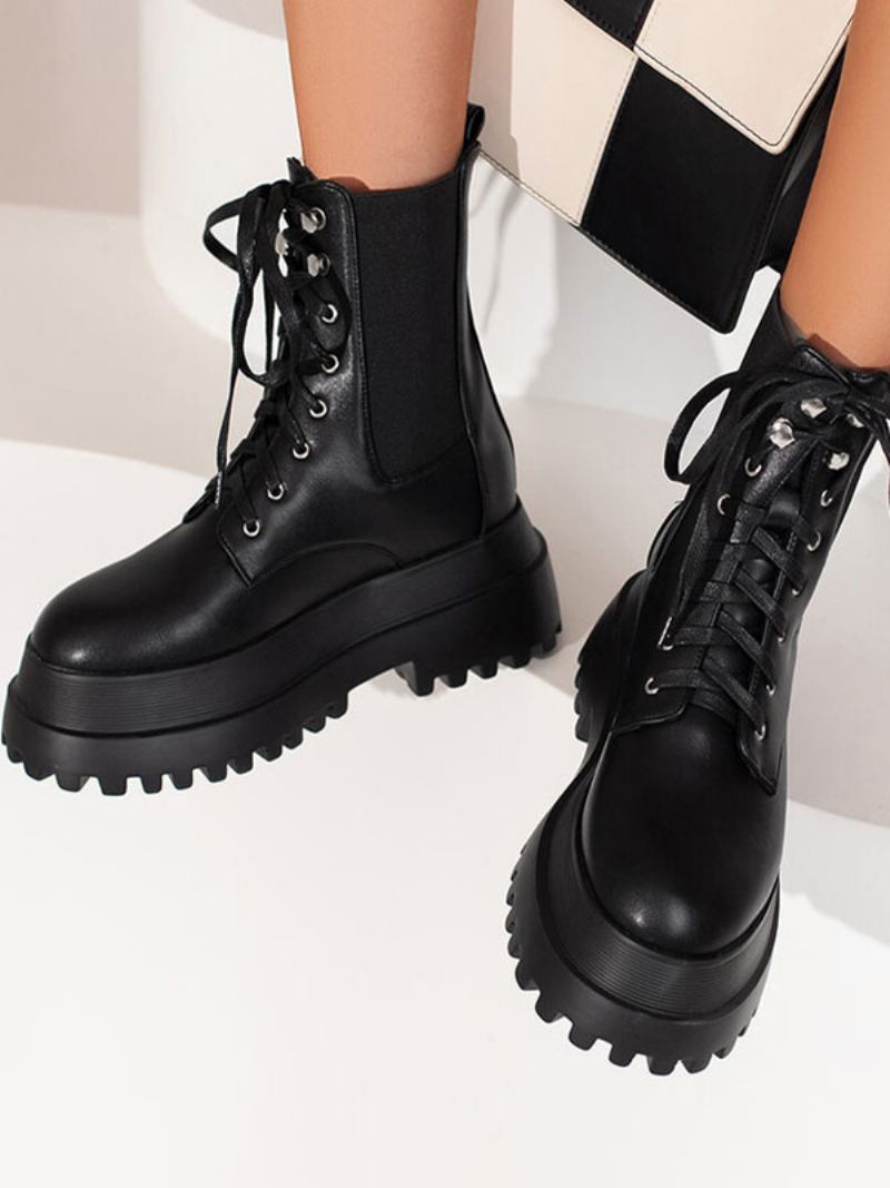 Botas Combate Femininas Pretas Com Plataforma Redonda E Salto Grosso