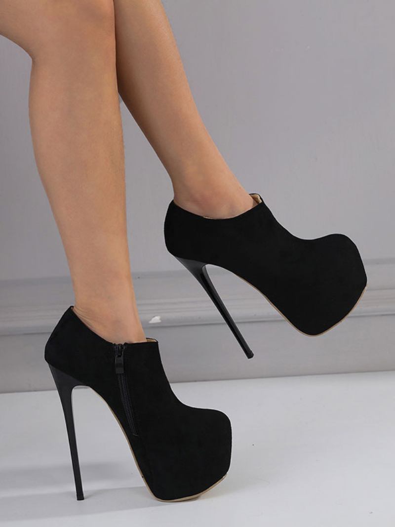 Botas Curtas Femininas Camurça Preta Couro Bico Redondo Salto Agulha