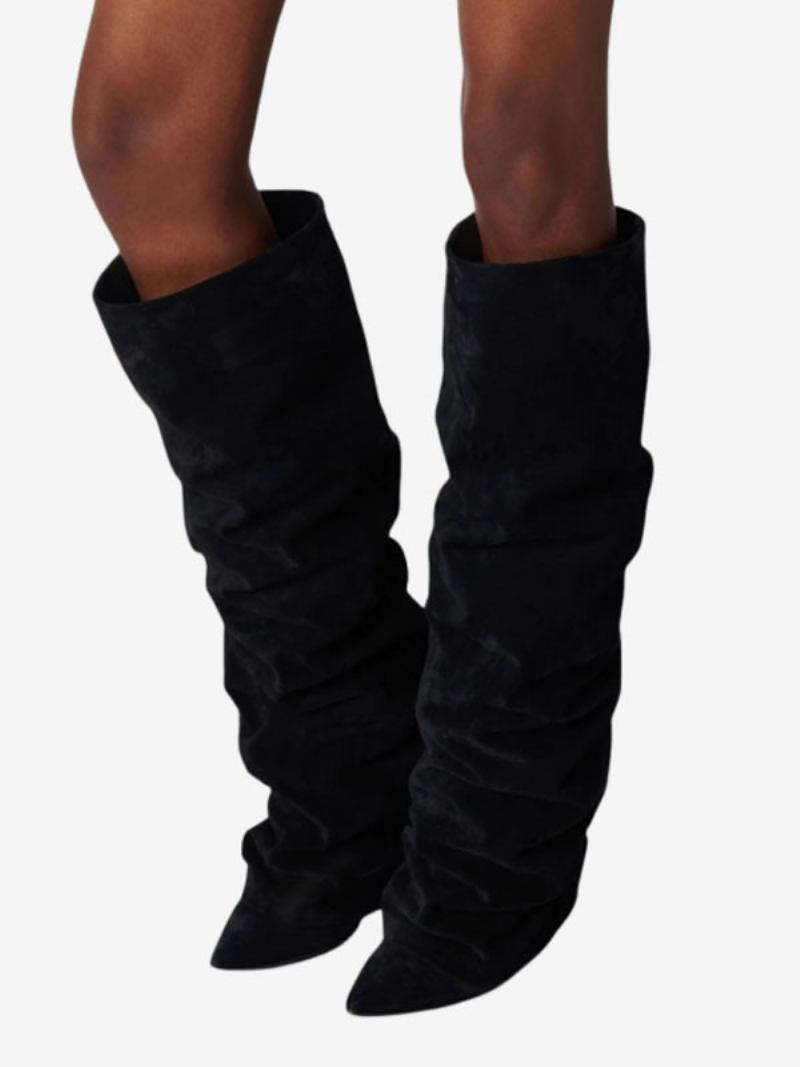 Botas Femininas Acima Do Joelho Bico Fino Preto Salto Agulha Camurça Desleixadas Dobráveis