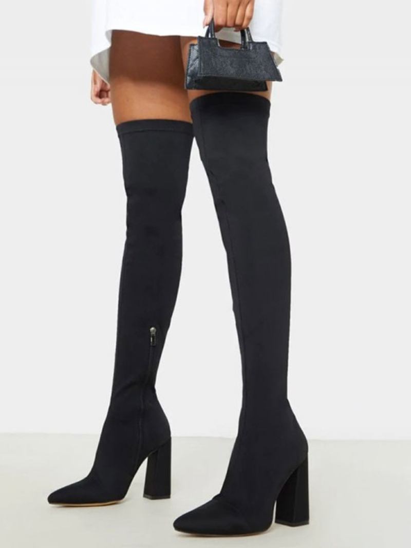 Botas Femininas Acima Do Joelho Tecido Elástico Preto Bico Redondo Salto Grosso Altas Na Coxa