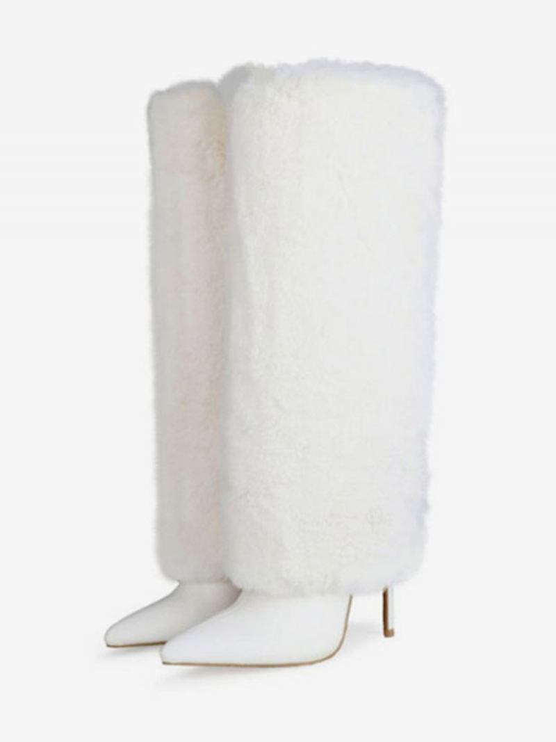 Botas Femininas Brancas Com Salto Agulha Felpudo E Cano Alto