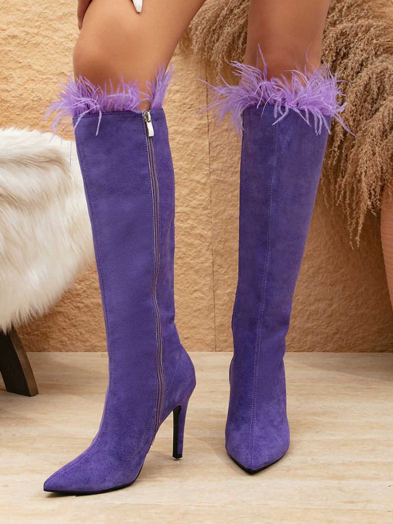 Botas Femininas Camurça Até O Joelho Bico Fino Roxo Com Detalhe Penas E Salto Alto