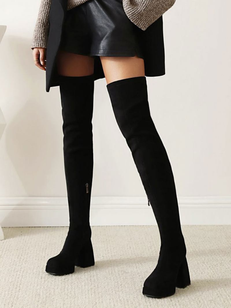 Botas Femininas Camurça Sintética Com Salto Bloco Sobre O Joelho