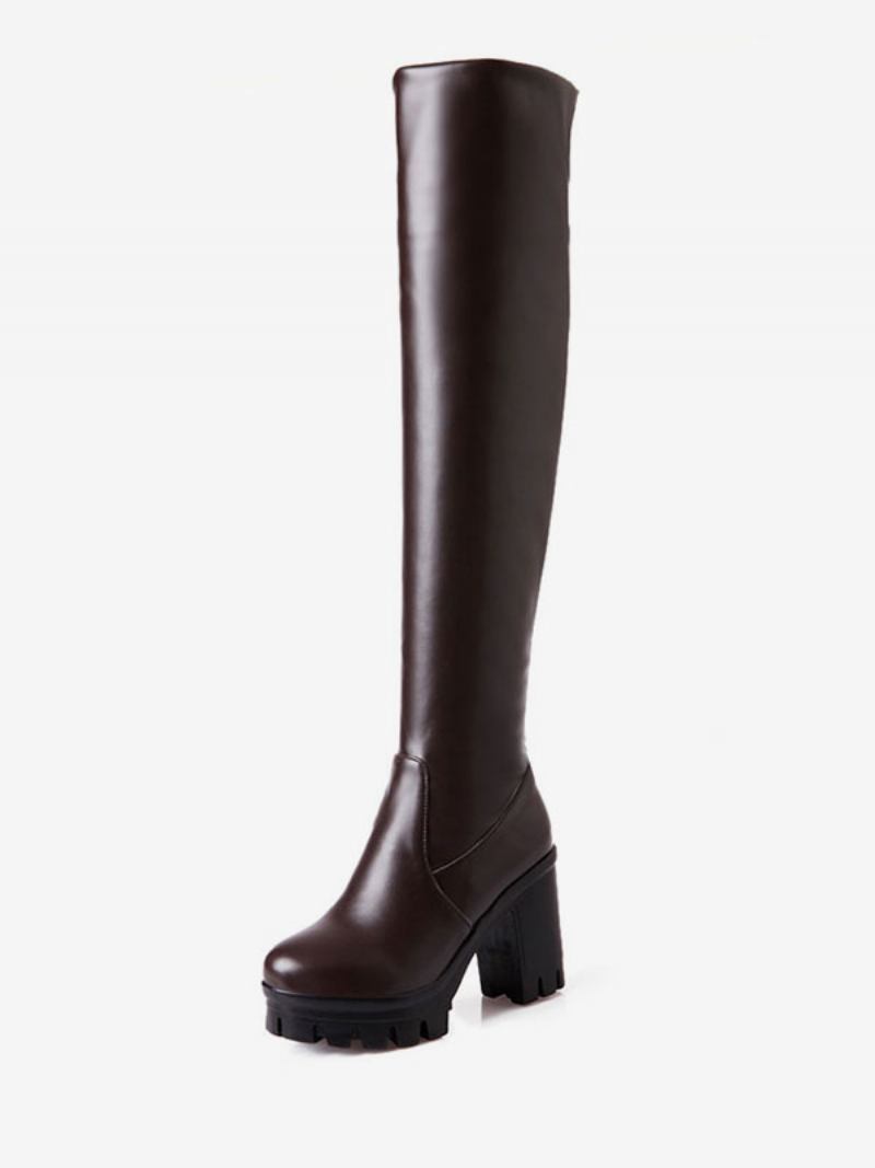 Botas Femininas Cano Alto Com Bico Redondo E Salto Grosso Sobre O Joelho