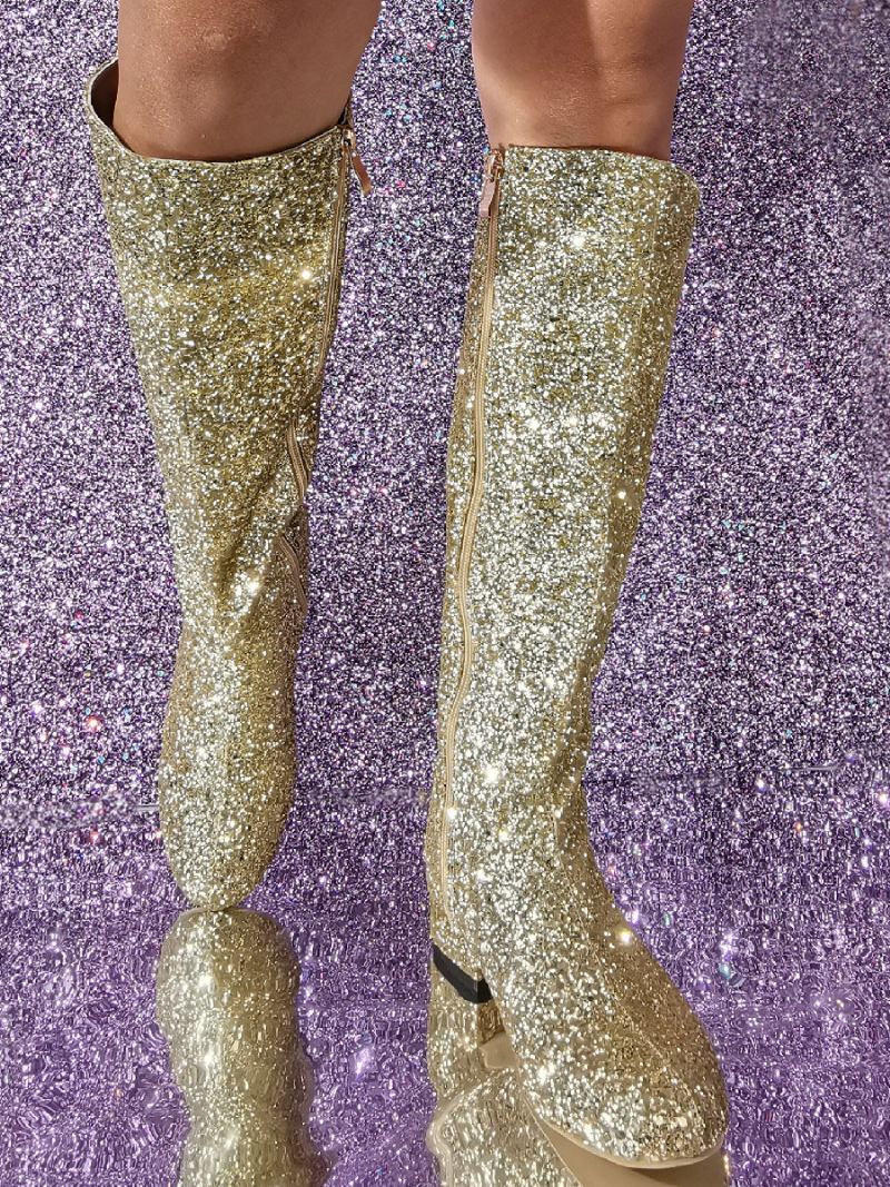 Botas Femininas Cano Alto Com Lantejoulas E Salto Cachorrinho