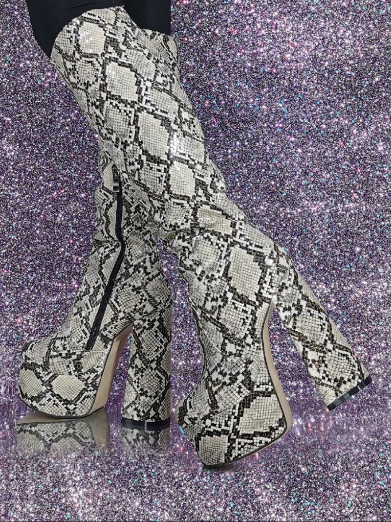 Botas Femininas Cano Alto Com Padrão Cobra E Salto Sexy