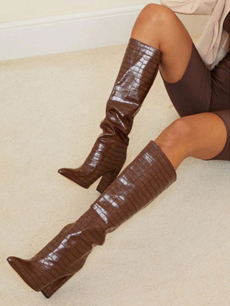 Botas Femininas Cano Alto Com Salto Grosso E Grão Pedra Na Panturrilha Larga