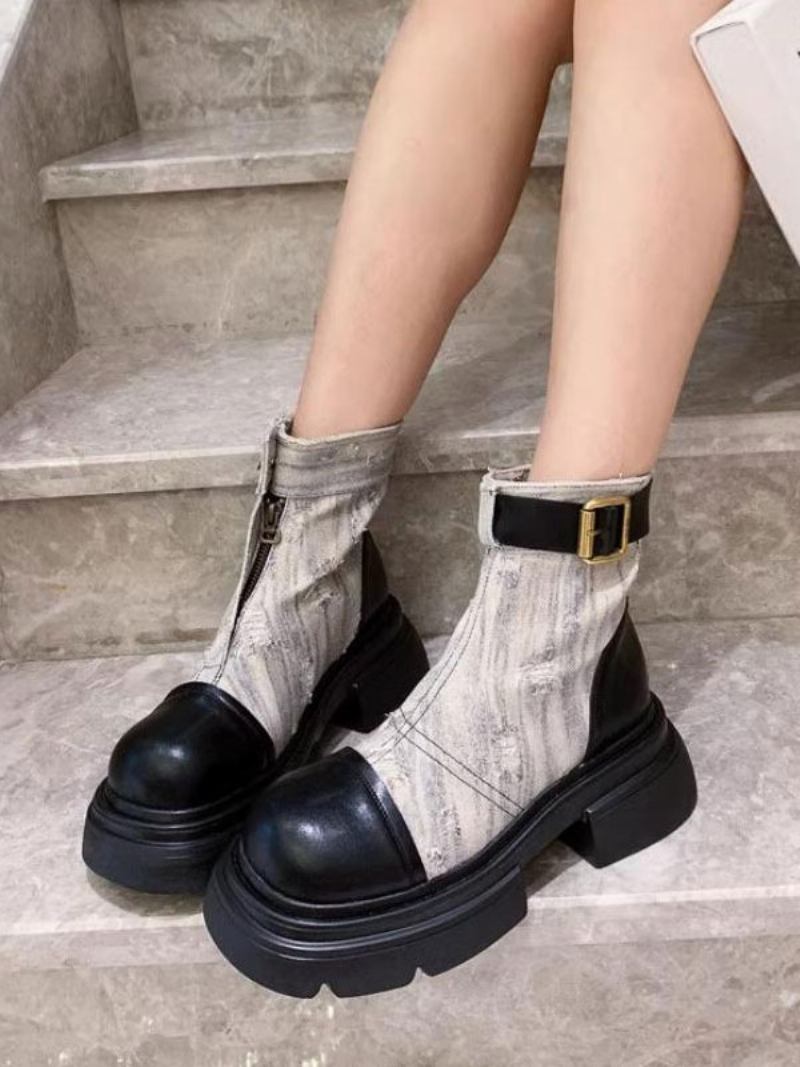 Botas Femininas Cano Curto Com Patchwork Jeans E Bico Redondo