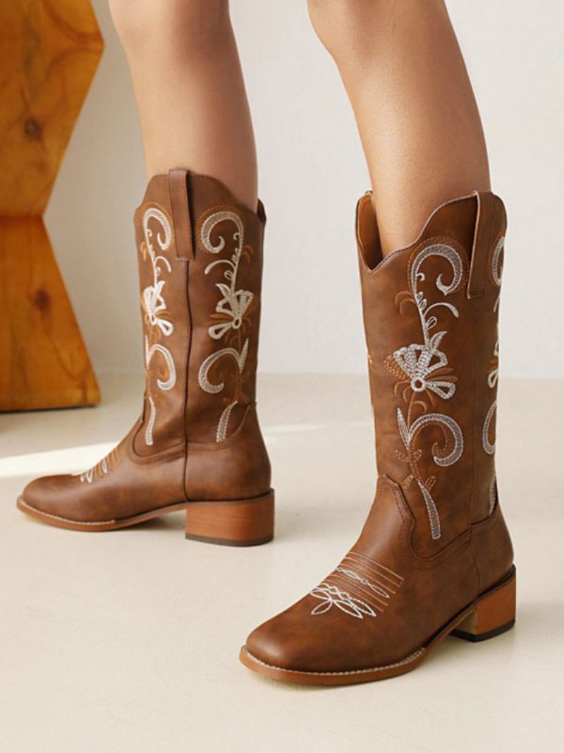 Botas Femininas Cano Médio Couro Pu Bico Redondo Cowboy Sapatos Casamento Vaqueira