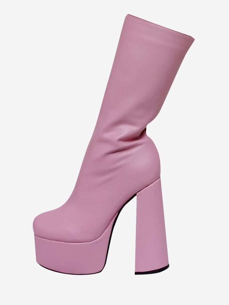 Botas Femininas Cano Médio Couro Pu Com Plataforma Redonda E Salto Grosso