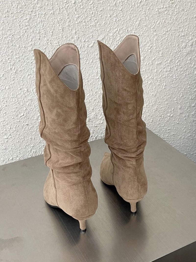 Botas Femininas Cano Médio Micro Camurça Bico Fino Salto Agulha