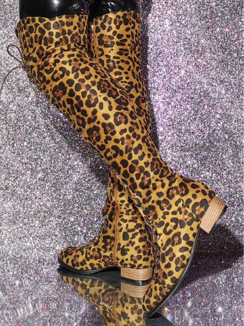 Botas Femininas Com Estampa Leopardo Na Coxa E Salto Alto Em Tecido Elástico