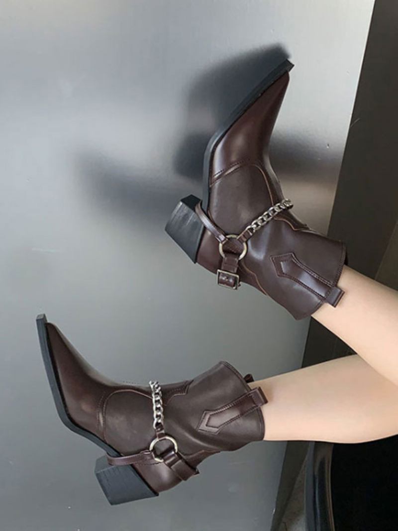 Botas Femininas Couro Pu Com Bico Fino E Salto Grosso