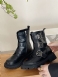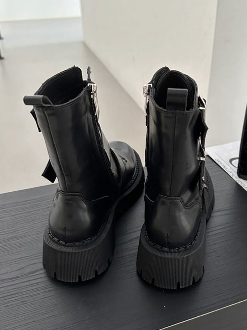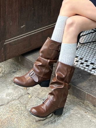 Botas Femininas Couro Pu Com Fivela Redonda E Salto Grosso