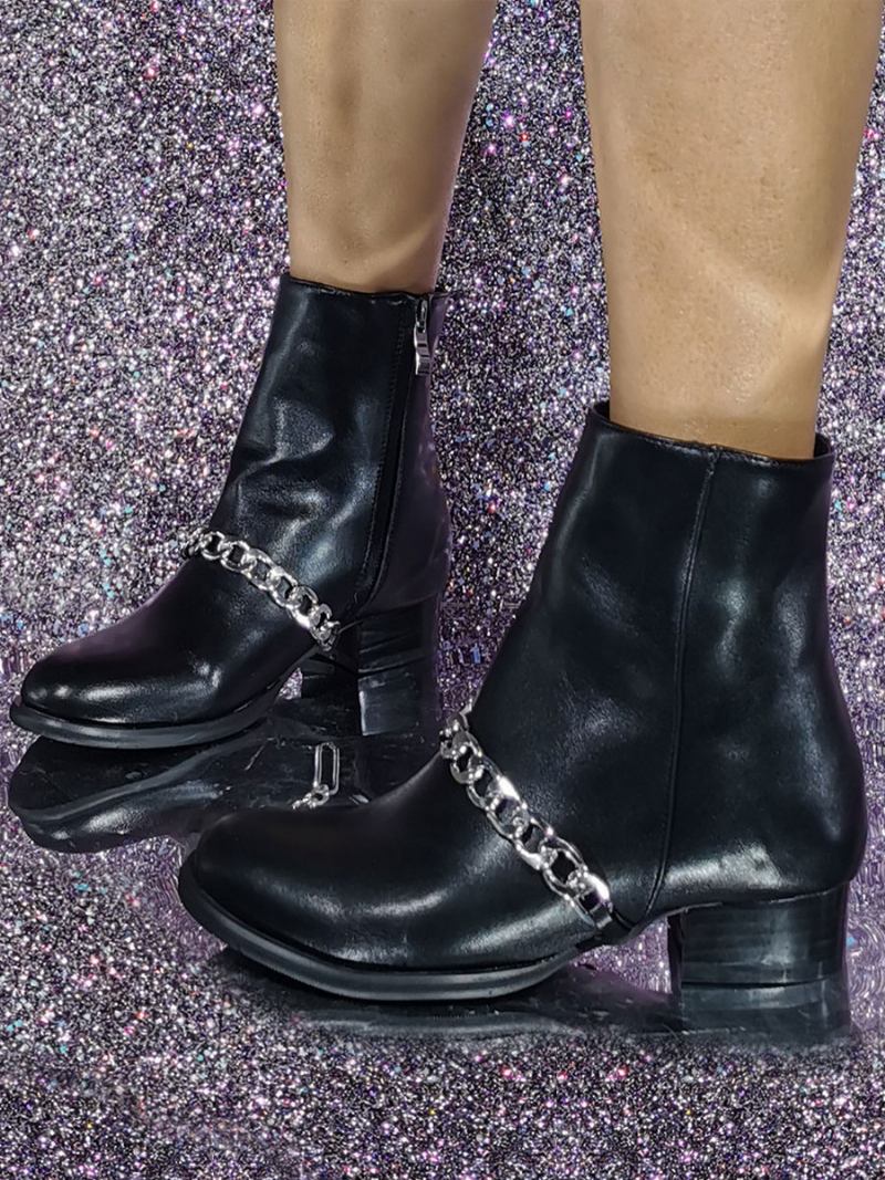 Botas Femininas Couro Pu Com Lantejoulas E Salto Redondo