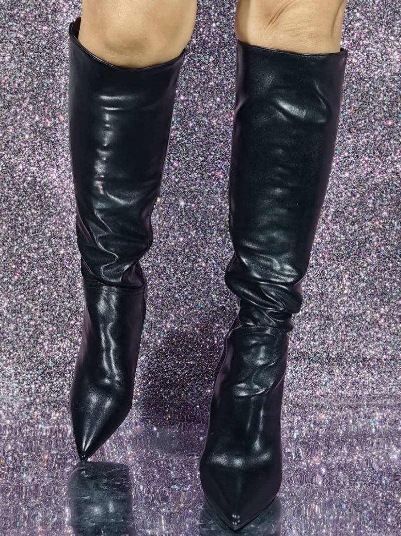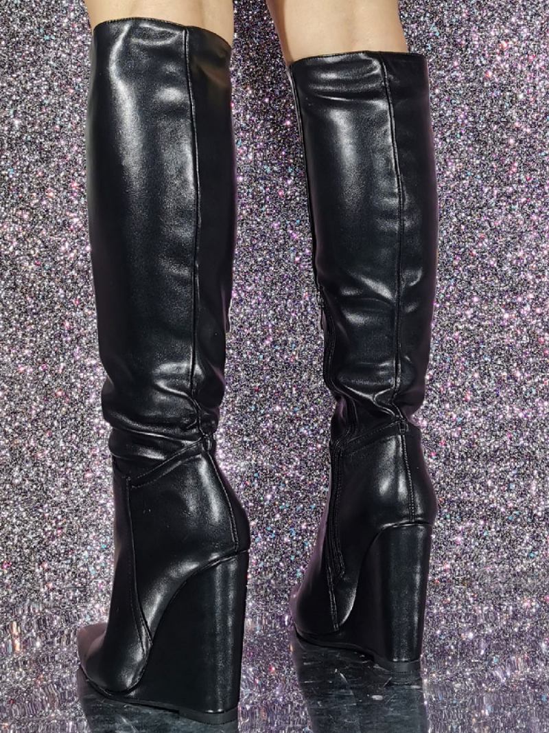Botas Femininas Couro Pu Com Salto Cunha E Cano Alto