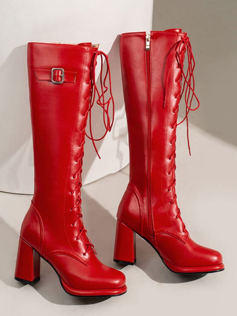 Botas Femininas Couro Pu Com Salto Grosso E Cano Alto