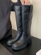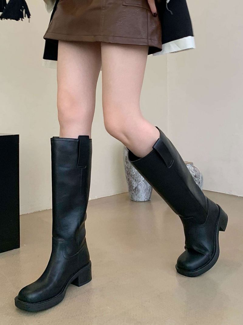 Botas Femininas Couro Pu Com Salto Grosso E Cano Alto