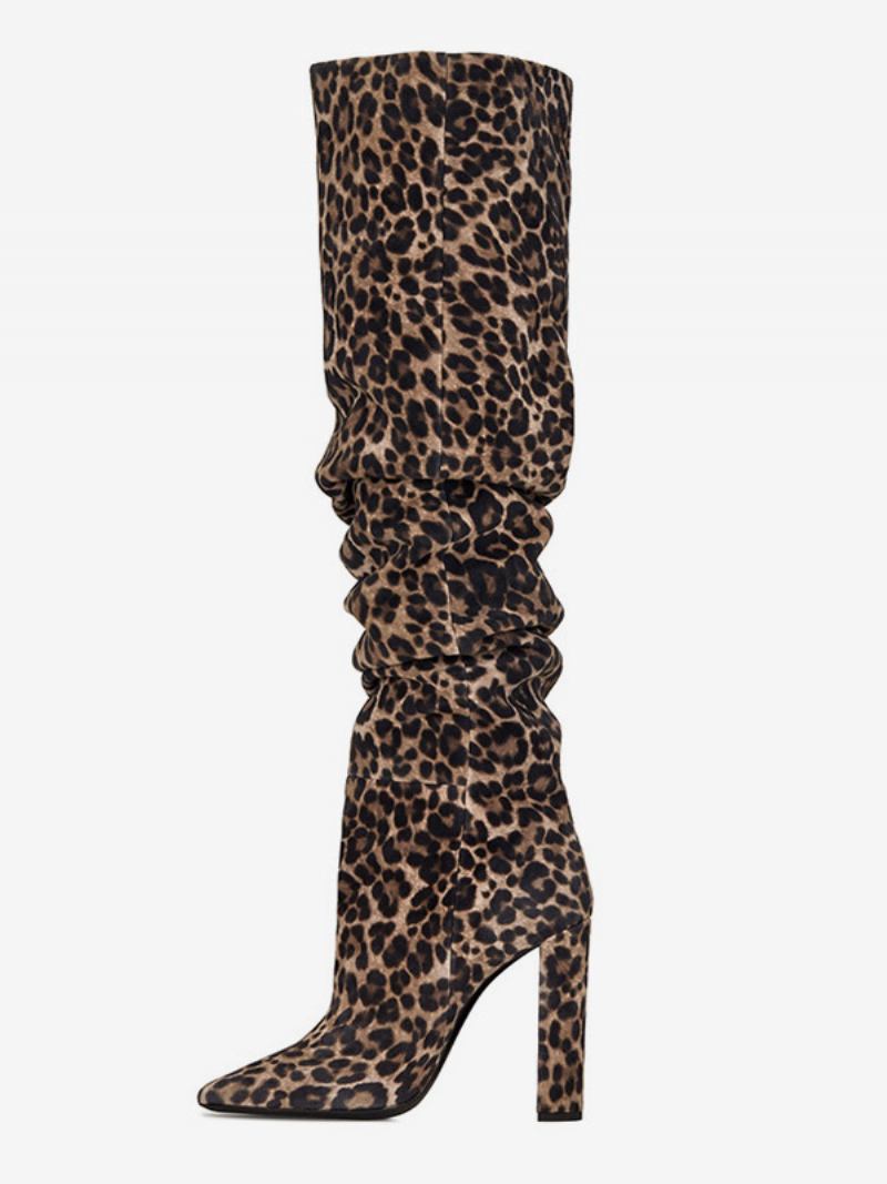 Botas Femininas Despojadas Cáqui Bico Fino Salto Grosso Altas Até O Joelho