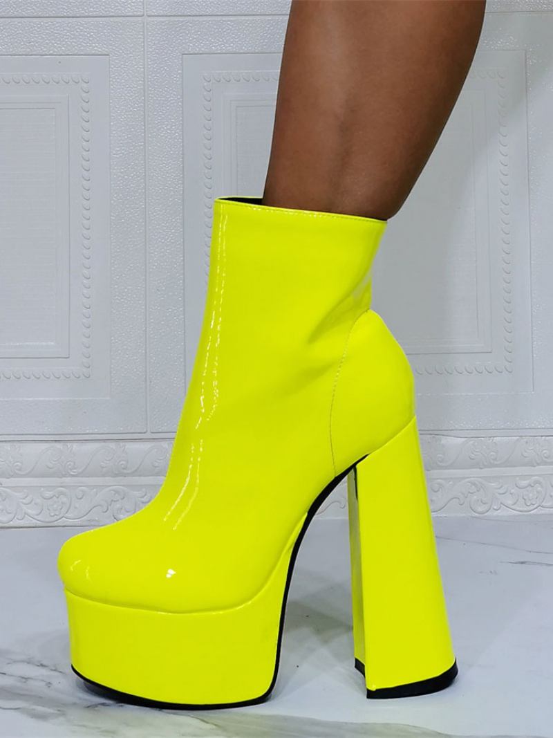 Botas Femininas Geométricas Com Bico Redondo Plataforma Salto Grosso Couro Pu Amarelas