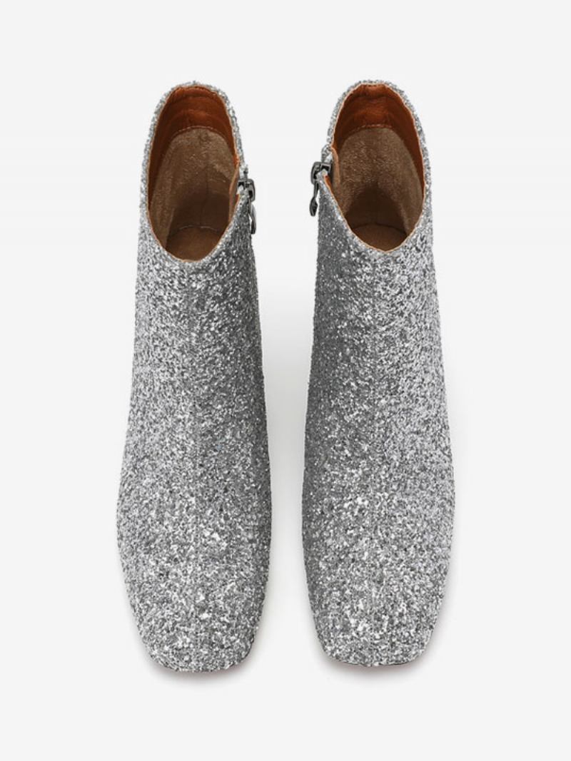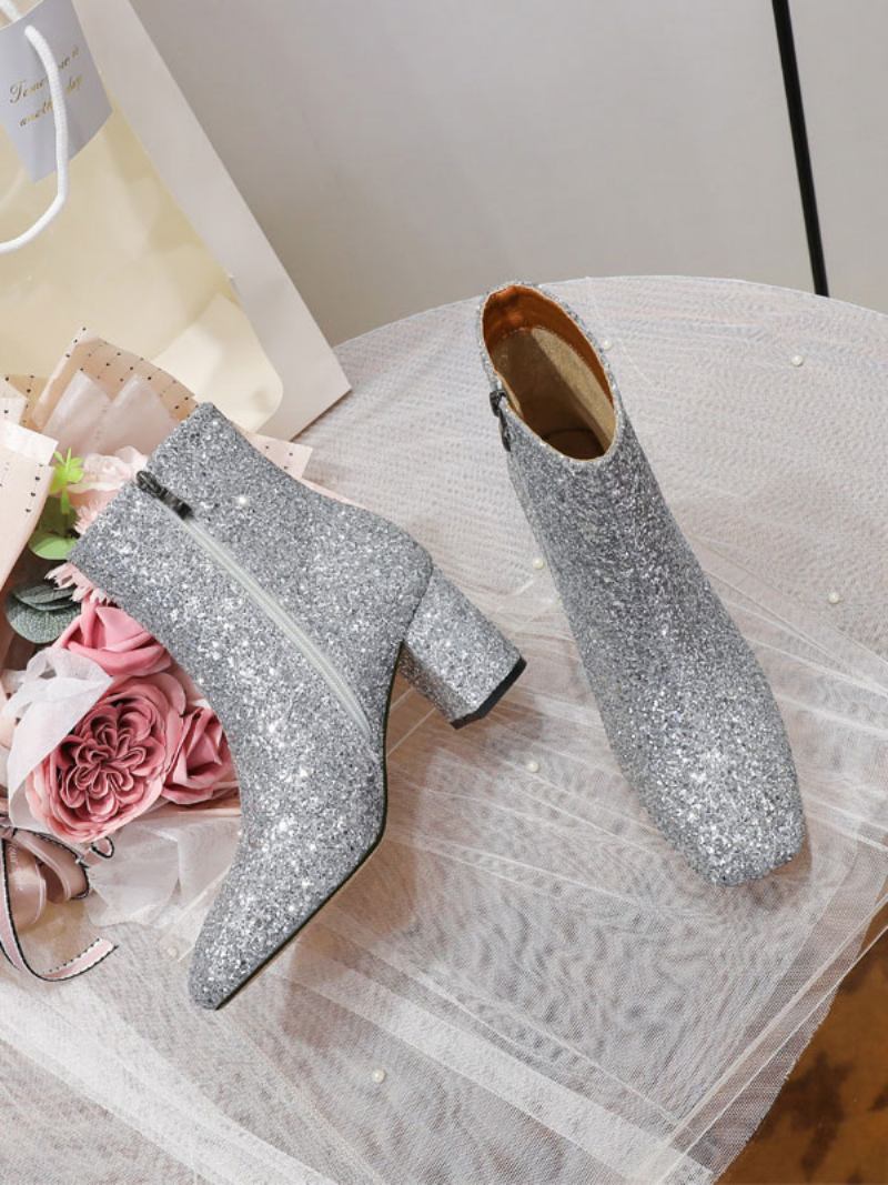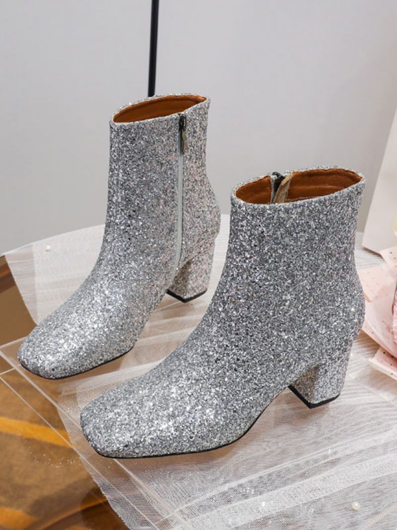 Botas Femininas Lantejoulas E Com Bico Quadrado Salto Grosso