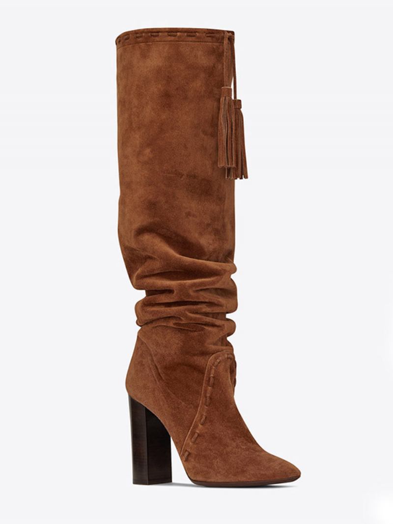 Botas Femininas Marrons Desleixadas Em Camurça Com Salto Grosso E Cano Alto