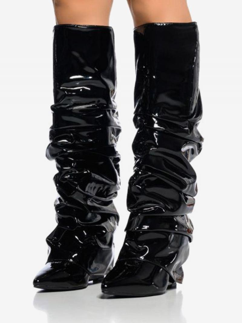 Botas Femininas Metálicas Cano Alto Bico Fino Prateado Salto Em Cunha Desleixadas