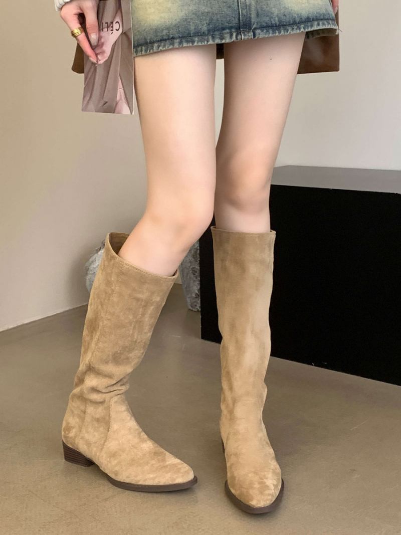 Botas Femininas Micro Camurça Com Salto Grosso E Cano Alto