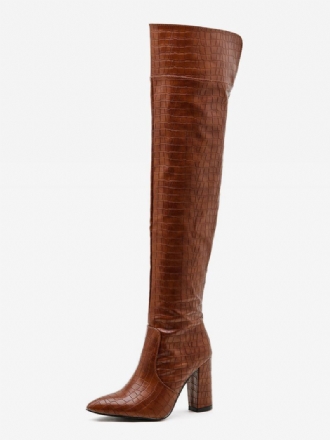 Botas Femininas Na Coxa Com Bico Redondo E Salto Agulha Em Couro Pu