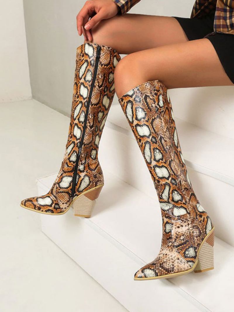 Botas Femininas Ocidentais Pele Cobra Até O Joelho Salto Bloco Cowgirl Rosa