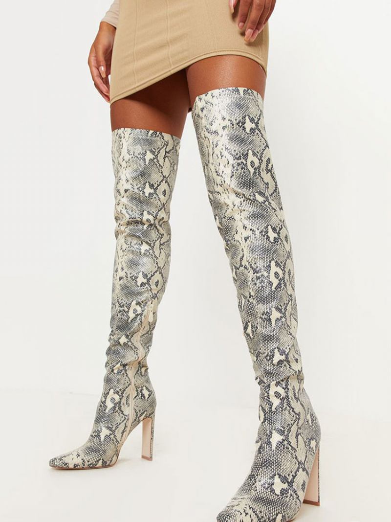 Botas Femininas Pele Cobra Com Salto Grosso E Cano Alto Cinza