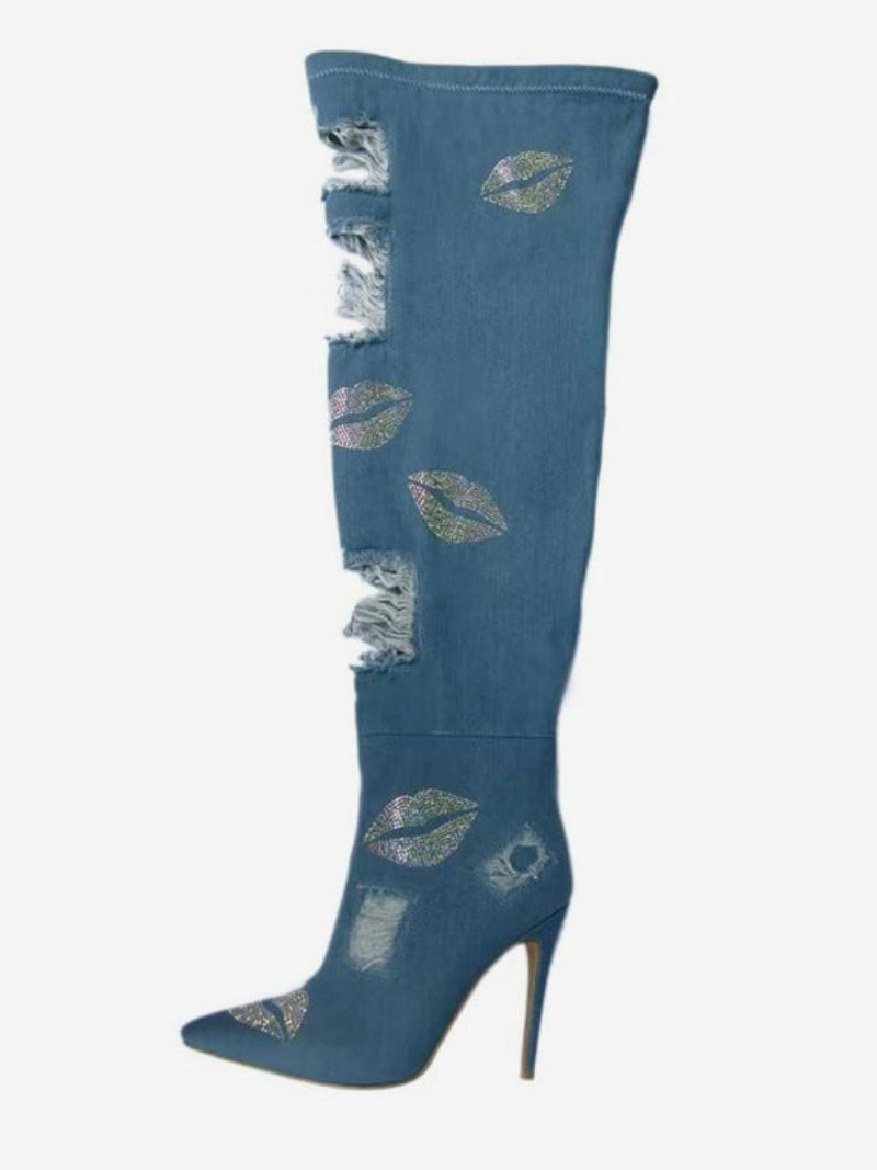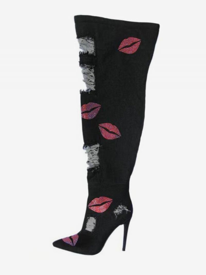 Botas Femininas Salto Agulha Com Strass E Coxa Alta Em Lona