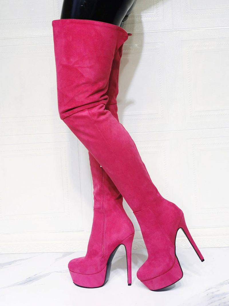 Botas Femininas Salto Alto Com Plataforma Na Coxa Em Camurça Rosa