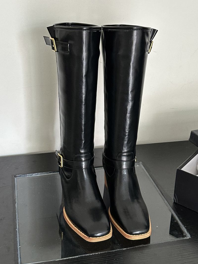 Botas Femininas Salto Médio Com Fivela Couro Pu Quadrado E