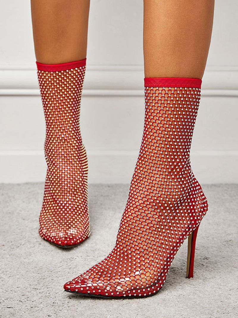 Botas Femininas Transparentes Bico Fino Salto Alto Cravejado Sexy Meia Arrastão