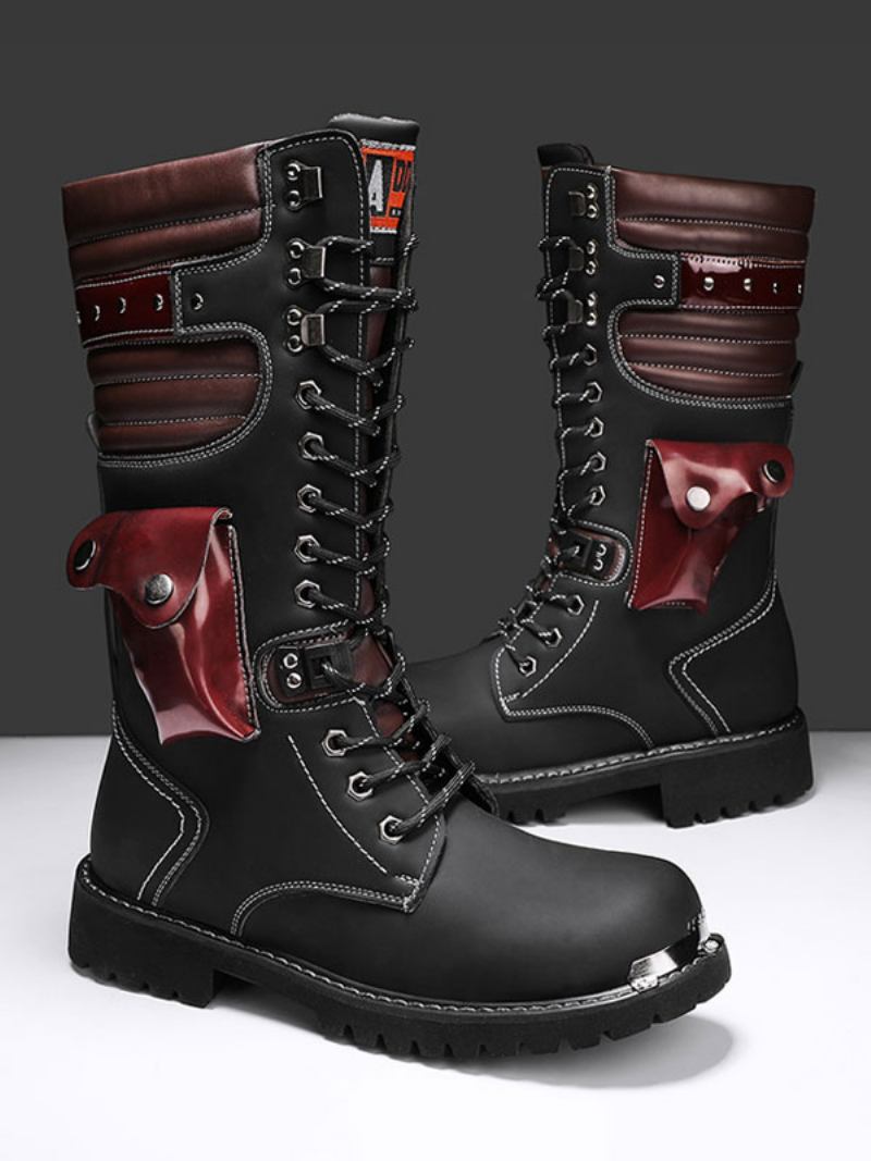Botas Masculinas Trabalho Couro Pu Dedo Redondo Combate Fivelas Steampunk Joelho Altas