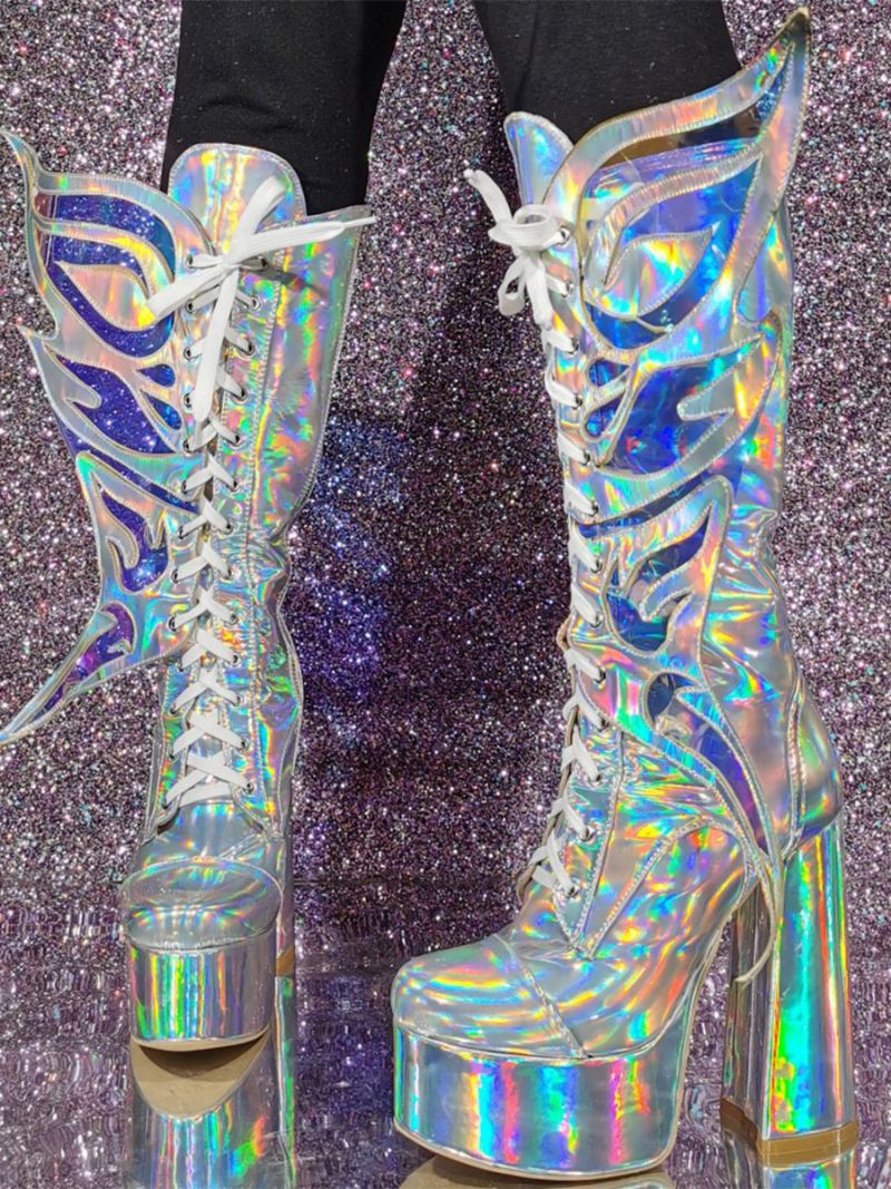 Botas Meia Panturrilha Com Plataforma Salto Grosso E Bico Redondo Superior Em Pu Patenteado Para Mulheres