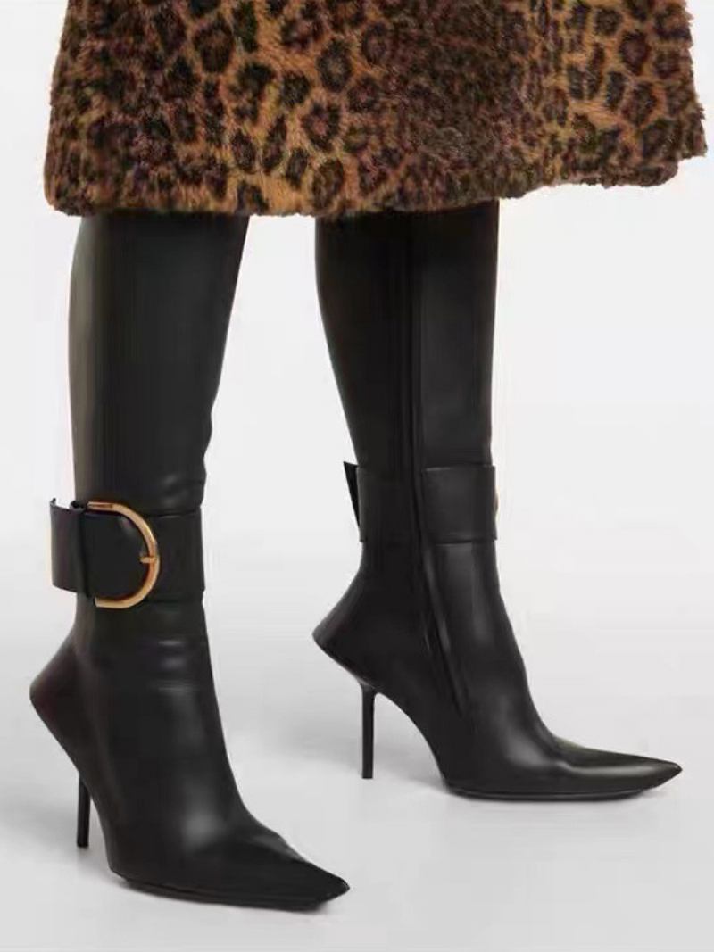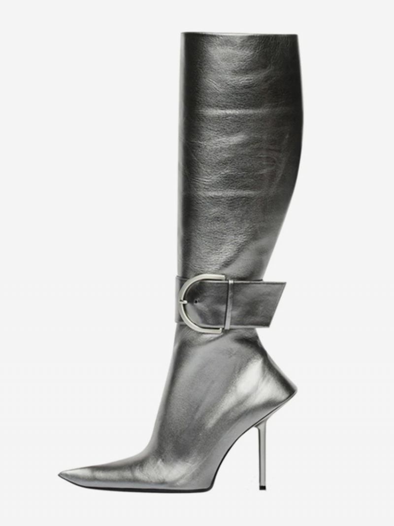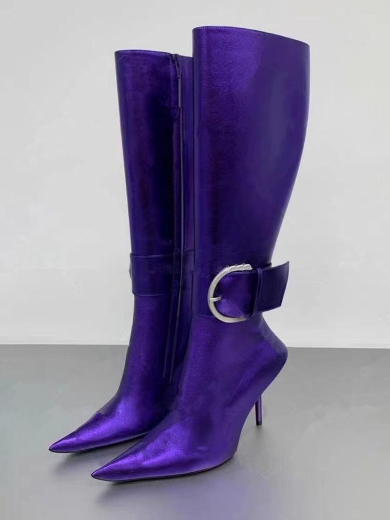 Botas Metálicas Suaves Panturrilha Femininas Com Fivela Roxa Bico Fino Salto Agulha