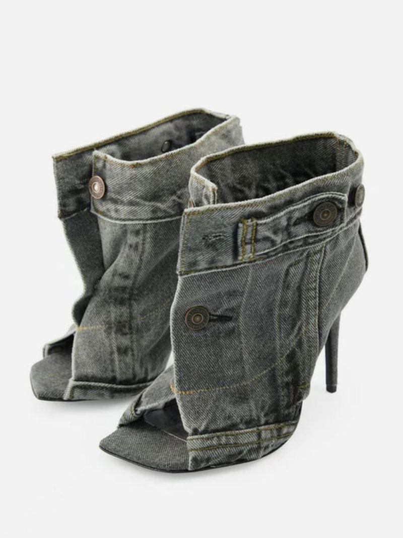 Botas Tornozelo Jeans Femininas Dedo Aberto Projetado Botão Detalhe Salto Alto