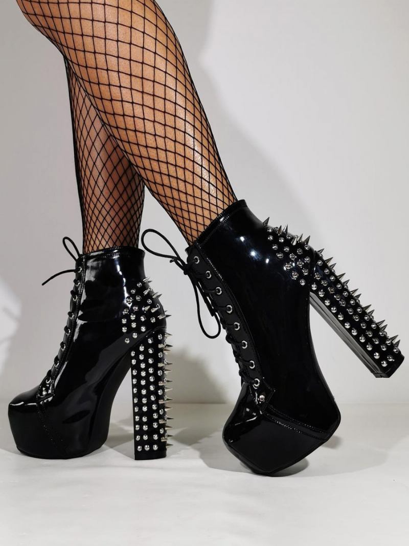 Botas Tornozelo Pretas Femininas Plataforma Dedo Do Pé Redondo Salto Grosso Cravejado Sexy Club Booties