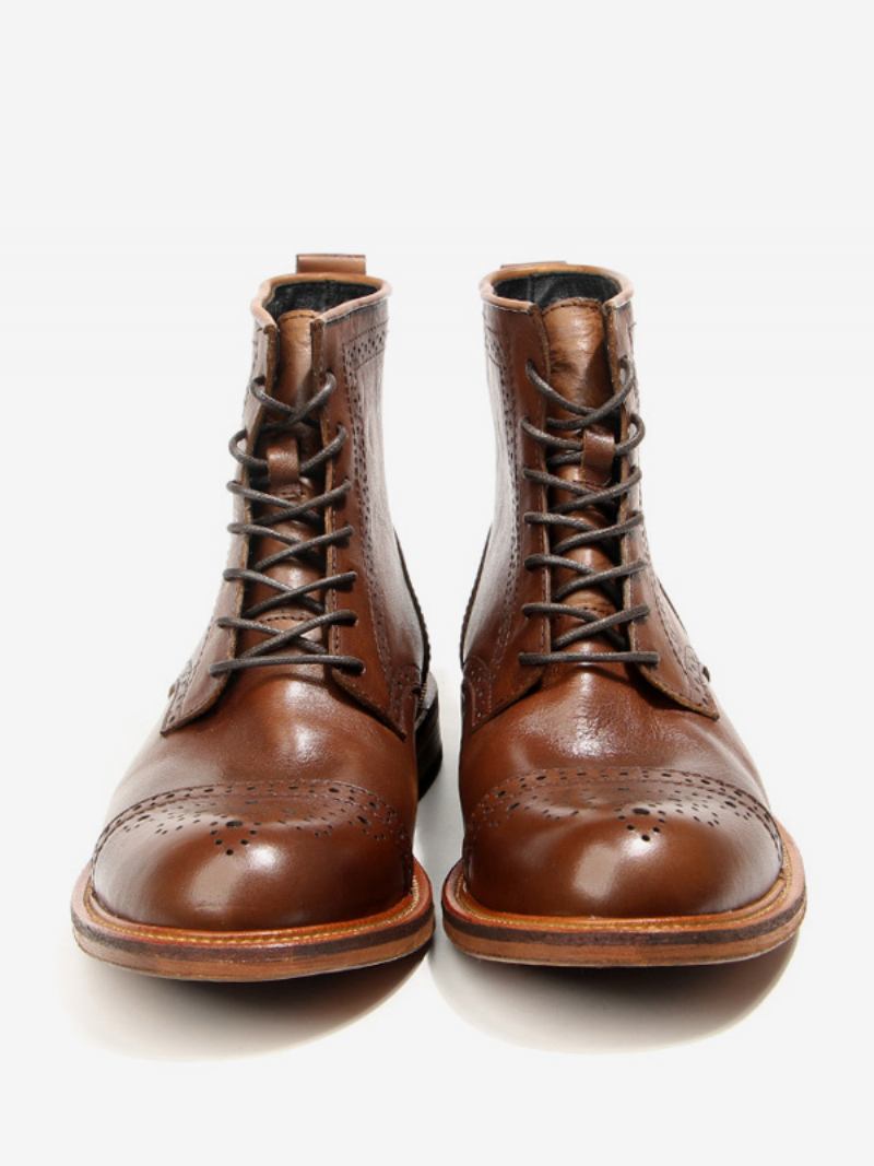 Brogue Masculino Esculpido Cano Alto Martin Trabalho Motocicleta Café Marrom Couro Dedo Do Pé Redondo Rendas Botas Curtas Retrô