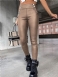 Calça Feminina Com Botões Pretos Em Couro Pu Cintura Alta