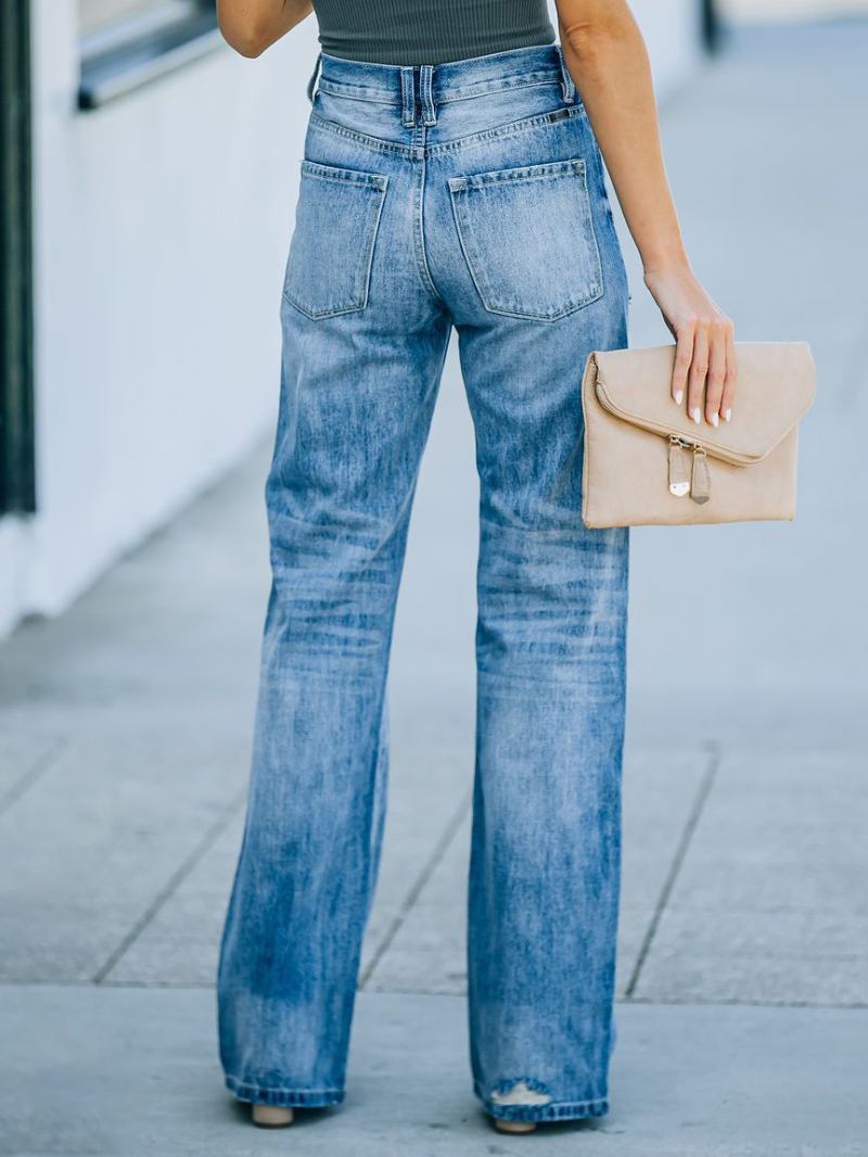 Calça Jeans Reta Feminina Cintura Alta Rasgada Primavera