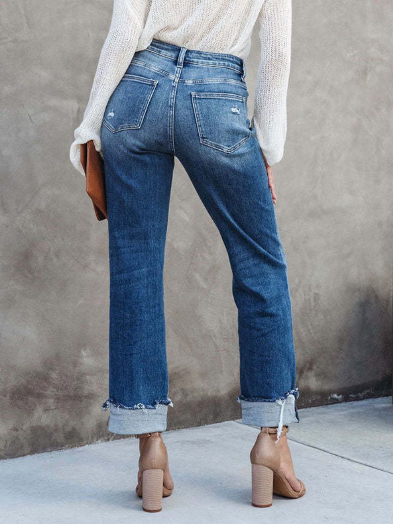 Calças Jeans Cortadas Com Botão Fly Straight Cor Sólida Para Mulheres